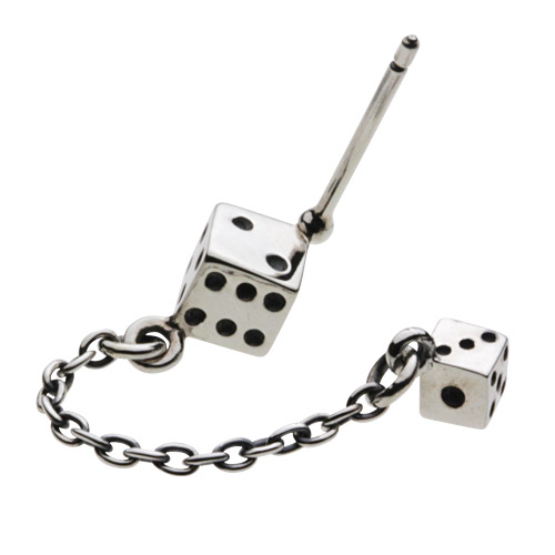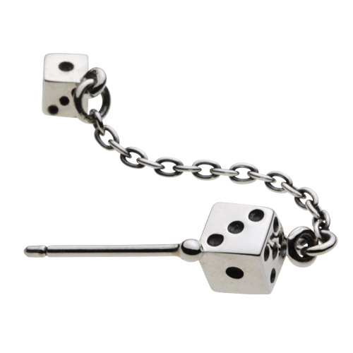 大きさの異なる二つのサイコロをチェーンで繋いだデザインのシルバーピアスです。