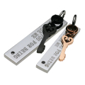 メッセージが刻まれたプレートと鍵モチーフと組み合わせたステンレスのペアペンダントです。