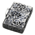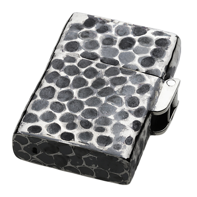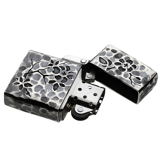 叩き加工の表面に梅の花を彫金した和柄の純銀製のオイルライターです。